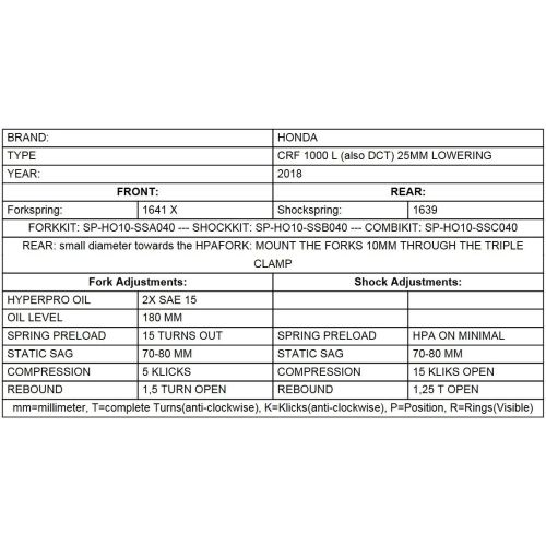 Replacement fork springs for lowering the front end by Dutch suspension specialists Hyperpro. This spring set provides you with a practical 25mm reduction in height without worsening the riding characteristics - at the expense of a little ground clearance. These progressive springs have been designed to match the Honda CRF1000L Africa Twin perfectly, offering a tremendous improvement in response and greater safety in extreme situations than the original fork springs.
