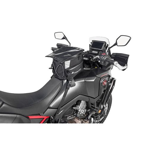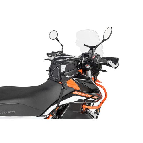 An expandable main compartment, two zipped outer pockets and a removable map pocket offer sufficient volume on long tours. The cable grommet and credit card pocket in the lid are Touratech standard.